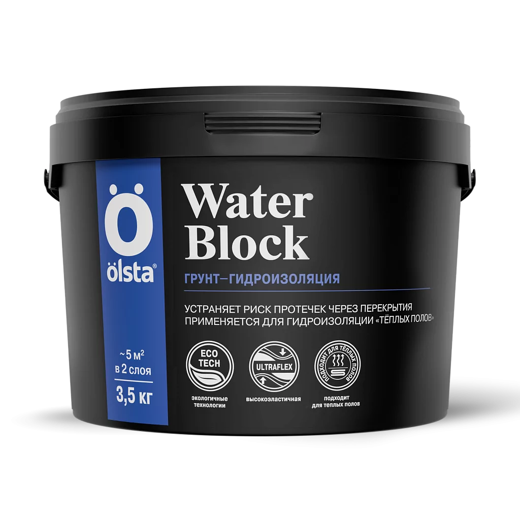 Применяется для создания гидроизоляционного слоя в ванных комнатах, санузлах, душевых и других помещениях, где необходимо устранить риск протечки через междуэтажные перекрытия. Материал окрашен в голубой цвет для лучшей визуальной оценки нанесения слоев. Совместим с фактурными декоративно-защитными покрытиями Olsta™.